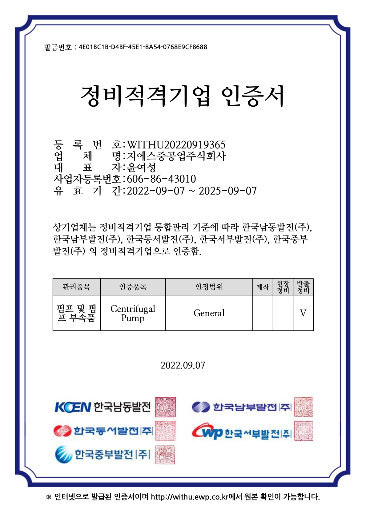 정비적격기업 인증서